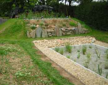 Pour ne pas utiliser l’eau du réseau comme nous le souhaitions, nous avons associé à notre projet une récupération d’eau pluviale dans une citerne cylindrique de 5000 litres que nous utilisons aujourd’hui pour les toilettes, la machine à laver et diverses utilisations. Ces 2 installations associées datent de l’hiver 2008. Nous avons effectué les travaux nous-mêmes en faisant appel à un terrassier.pour qui c’était la première réalisation de ce type. La phyto-épuration ( sans compter la récupération d’eau pluviale) coûte sensiblement le même prix qu’une installation avec filtre à sable.